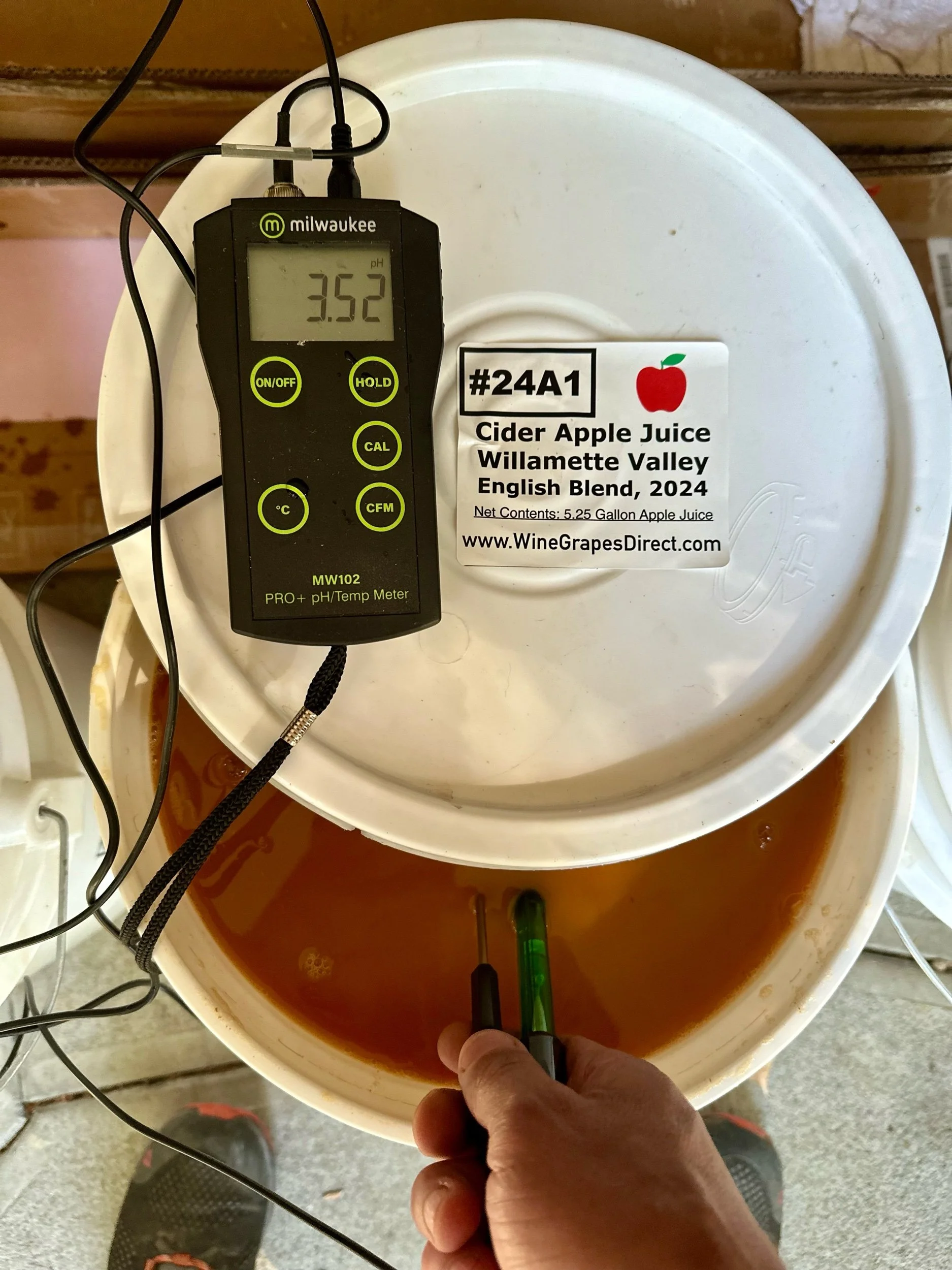 Cider juice for home use: Frozen cider apple juice, perfect for making cider at home with authentic flavor. Quick pH test of fresh cider apple juice to ensure balanced acidity for fermentation.